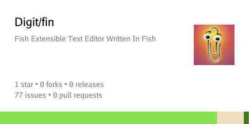 Digit@lemmy.wtf to Technology@lemmy.worldEnglish · 4 months agofin - fish extensible text editor written in fishcodeberg.orgexternal-linkmessage-square3linkfedilinkarrow-up10arrow-down11file-text
