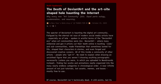 Michael_Washboard@lemmy.blahaj.zone to Technology@lemmy.worldEnglish · 27 days agoThe Death of DeviantArt and the art-site shaped hole haunting the Internet -- Multi-hyphenatetorrent-empress.leaflet.pubexternal-linkmessage-square27linkfedilinkarrow-up1171arrow-down12